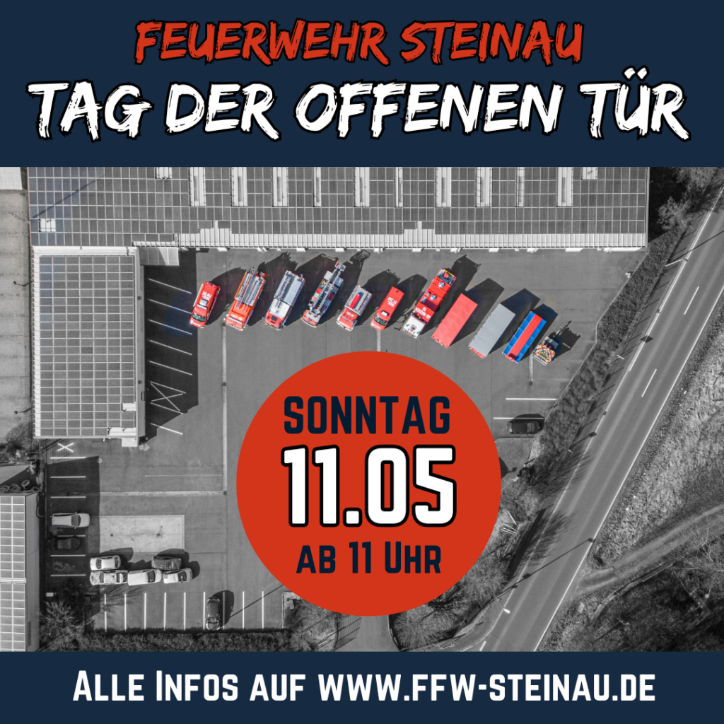 Tag der offenen Tür 2025 am 11.05.25 / Allgemein Wir laden euch herzlich ein, gemeinsam mit uns einen spannenden und unterhaltsamen Tag zu erleben. Seid dabei, wenn das Feuerwehrhaus seine Tore öffnet! 📅 Wann? Sonntag, der 11.05.25 ab 11 Uhr 📍 Wo? Feuerwehrhaus | Am Steinaubach 2 Jetzt teilen:teilen merken teilen drucken E-Mail